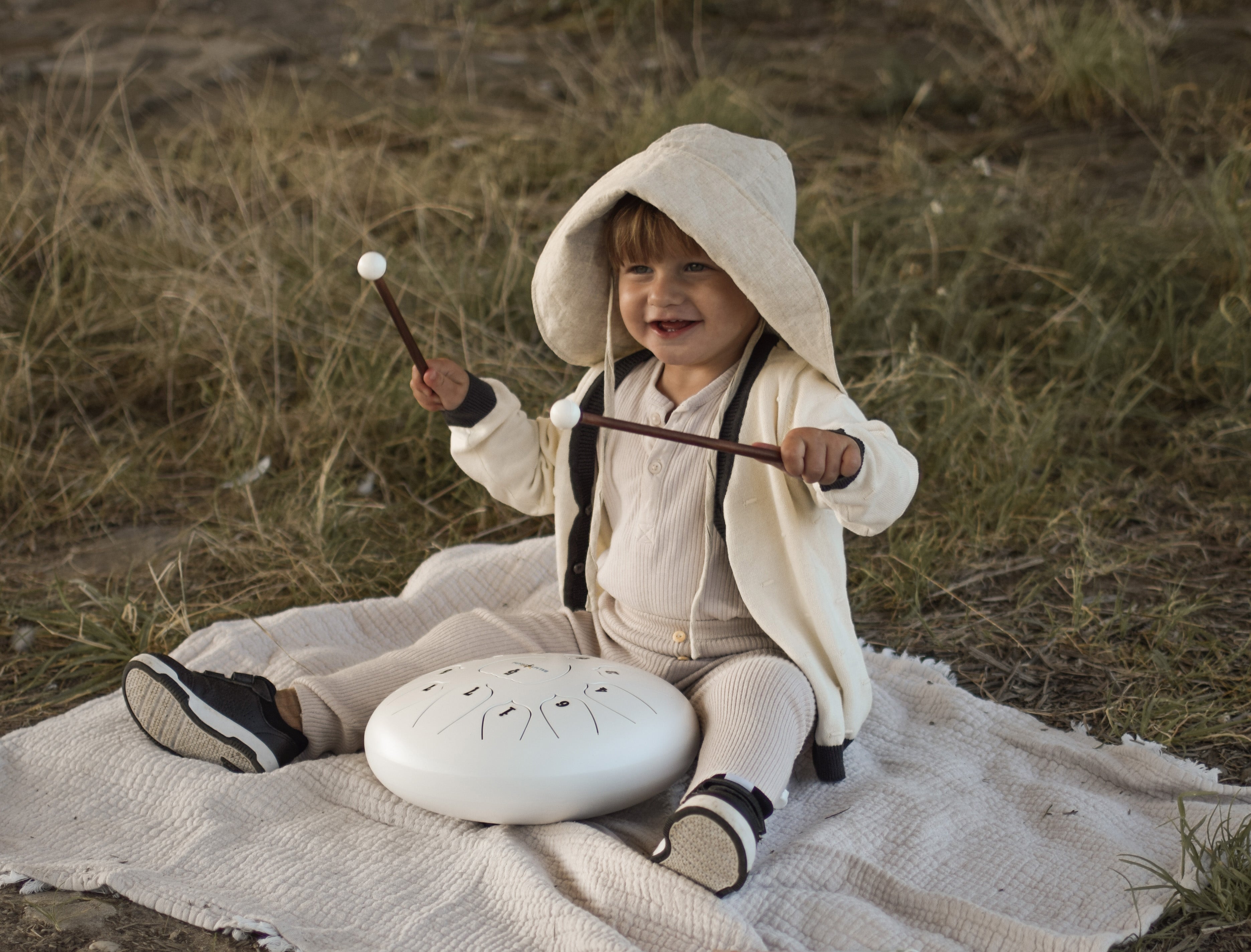 I brought the Balmy Drum™ with us and started playing it with Ethan before going to sleep, hoping it would work despite the noise coming from outside.